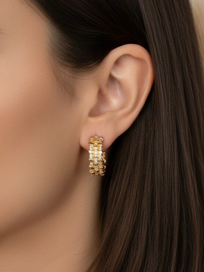 O Brinco de Argola Entrelaçado Cravejado Dourado é sinônimo de elegância e sofisticação. Seu design moderno com detalhes entrelaçados traz um toque de estilo único, enquanto as pedras cravejadas trazem um brilho encantador.