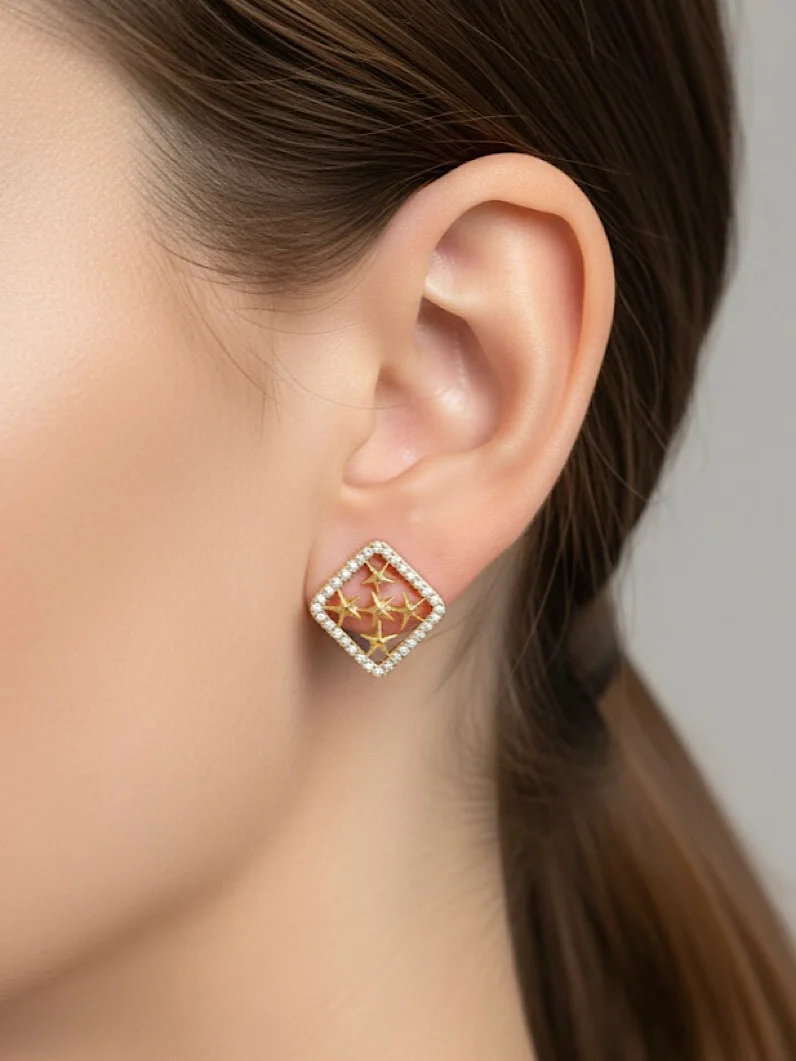O Brinco Folheado Quadrado de Estrelas Cravejadas Dourado é a combinação perfeita entre elegância e originalidade. Seu design em formato quadrado com delicadas estrelas cravejadas transmite brilho e charme, tornando-o uma peça única e sofisticada.