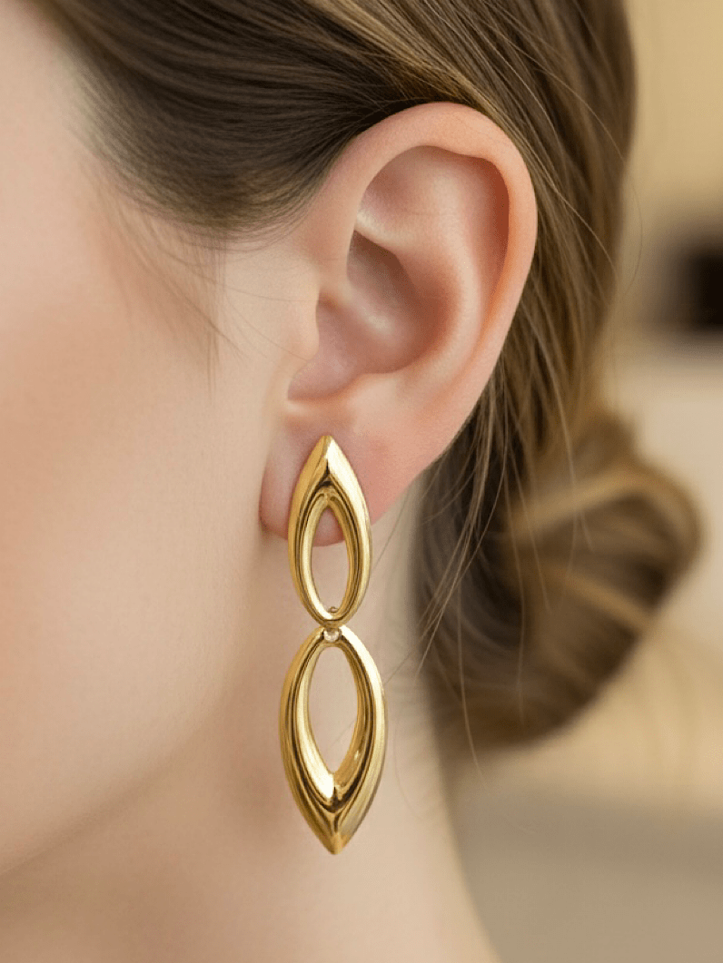 Este brinco apresenta duas gotas vazadas em composição fluida e moderna, criando um visual marcante e sofisticado. As formas orgânicas trazem movimento e leveza visual, enquanto o acabamento dourado traz elegância à peça. Ideal para quem busca um acessório de presença, ele transforma o look com estilo e personalidade.