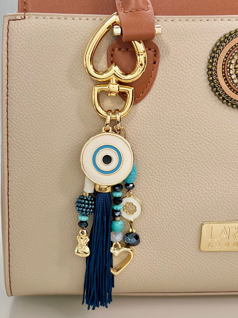 O olho grego simboliza proteção contra energias negativas e, nesta versão em marinho e branco com detalhes dourados. Ideal para quem ama itens com estilo e boas vibrações! Perfeito para usar nas chaves, na bolsa, mochilas e nécessaires.