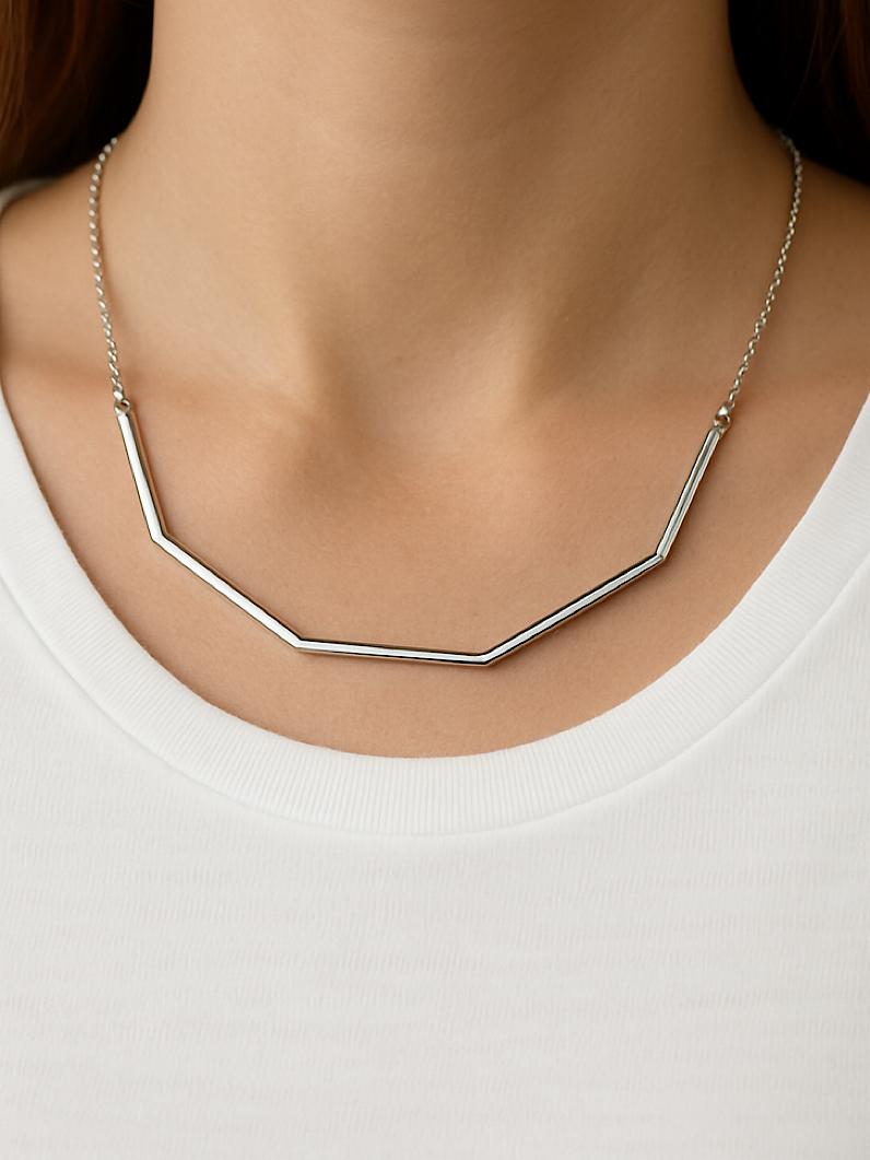 Moderno e sofisticado, o colar de aro geométrico é a escolha perfeita para quem busca um acessório cheio de personalidade. Seu design estruturado, com formas limpas e contornos marcantes, valoriza o colo e transforma qualquer look básico em uma produção elegante.