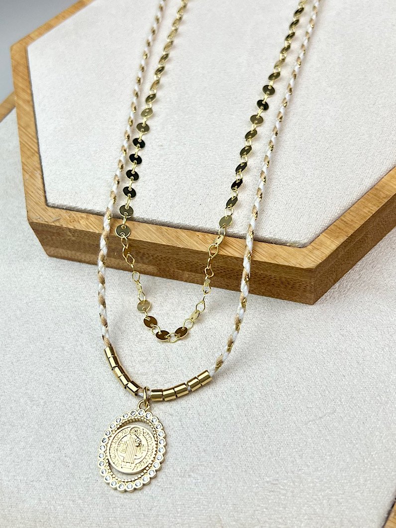 O Colar Duplo Estela de São Bento Cravejado Dourado é a combinação perfeita entre fé e sofisticação. Com duas correntes delicadas em composição harmoniosa, a peça traz como destaque a medalha de São Bento, ricamente cravejada, proporcionando brilho e elegância na medida certa.