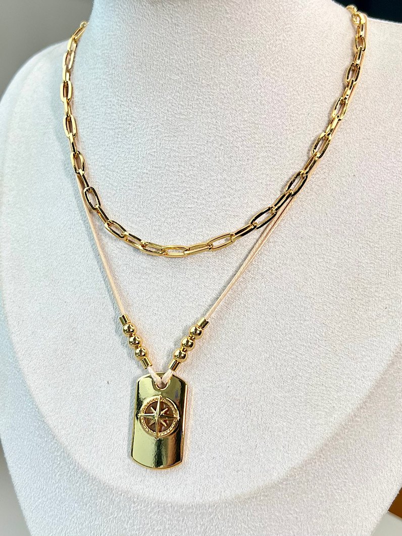 O Colar Duplo Isabela une estilo e modernidade em uma composição elegante. A primeira camada traz uma corrente delicada com elos alongados, cheia de presença. Na segunda camada, um cordão claro destaca o pingente retangular em dourado, trabalhado em alto relevo com a Rosa dos Ventos, trazendo um toque sofisticado e contemporâneo à peça.