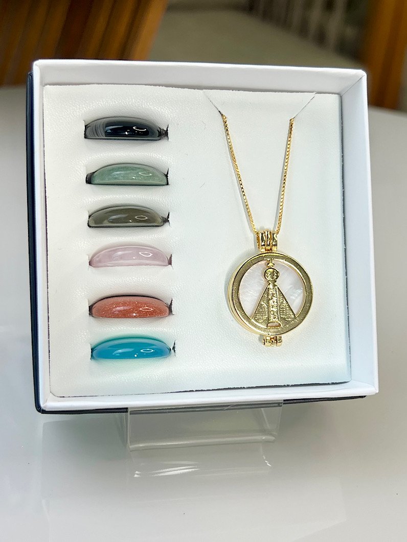 Carregando fé, proteção e significado, este relicário da Nossa Senhora acompanha 7 pedras naturais, cada uma com uma energia especial, permitindo que você troque as pedras conforme seu momento, intenção ou preferência. O colar pode ser usado de duas formas: com a frente exibindo a imagem da Nossa Senhora ou com o verso liso e sem detalhes.