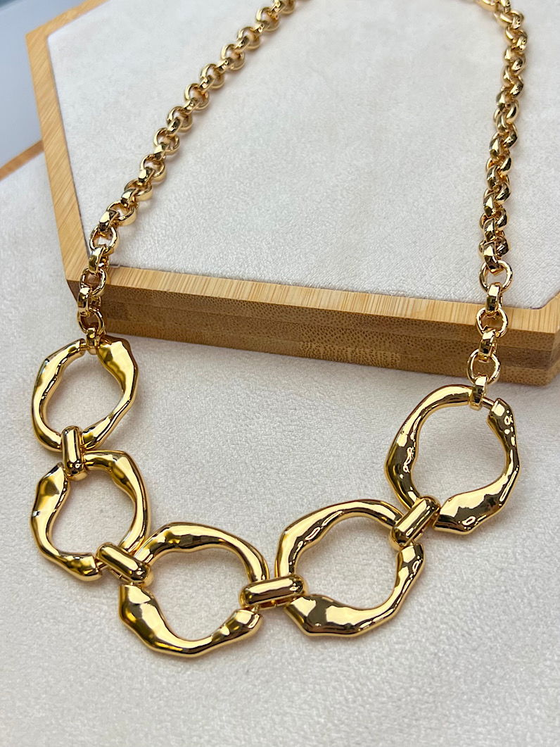 Um colar que une estilo moderno e sofisticação. Os elos martelados conferem um visual único e elegante, com design orgânico que se destaca sozinho. Uma peça versátil e marcante, perfeita para valorizar qualquer look, do casual ao sofisticado, adicionando personalidade e charme em todas as ocasiões.