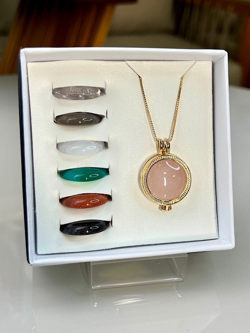 Este relicário acompanha 7 pedras naturais, cada uma com uma energia especial, permitindo que você troque as pedras conforme seu momento, intenção ou preferência.