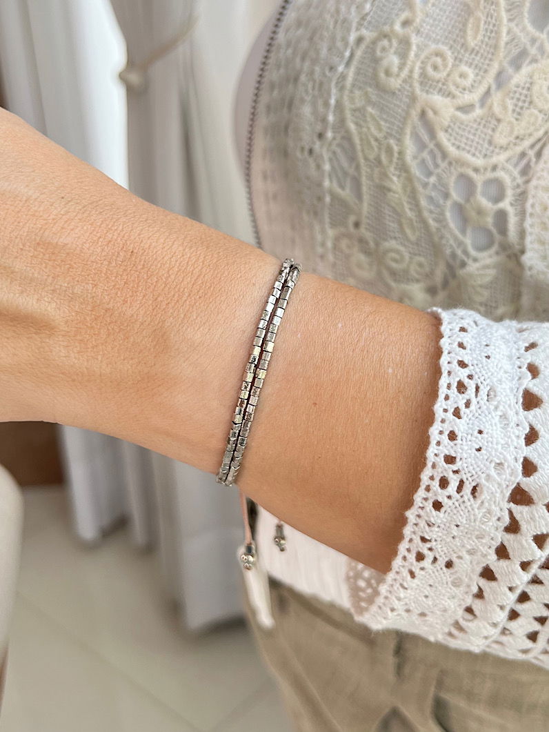 A Pulseira Ajustável com 2 Tiras de Canutilhos Quadrados é uma peça delicada e moderna, que combina elegância e sofisticação. As duas tiras de canutilhos quadrados criam um visual clean, perfeito para quem busca um toque sutil e estiloso. O fecho ajustável de macramê traz praticidade, adaptando-se perfeitamente ao pulso. Ideal para ser usada sozinha ou combinada com outras pulseiras para criar um mix de estilo. Uma escolha perfeita para quem deseja um acessório versátil, moderno e elegante para qualquer ocasião.