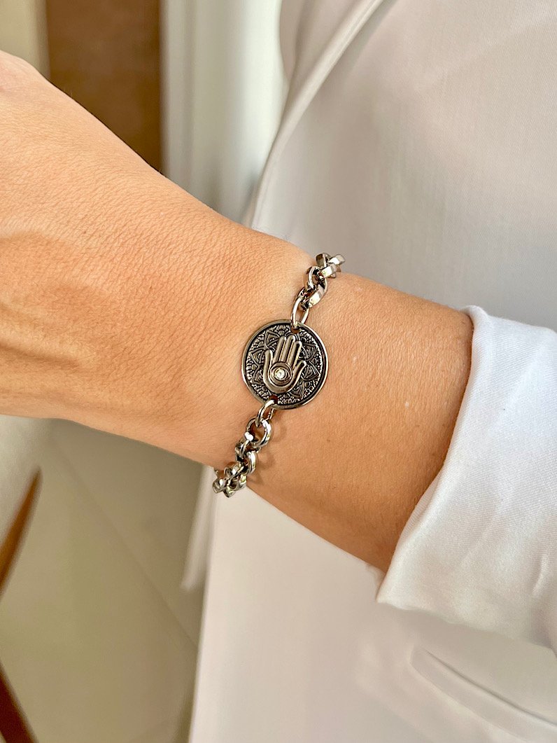A Pulseira Iara Elo Português Mão de Fátima une proteção, elegância e estilo em um único acessório. Composta por elos portugueses e o símbolo da Mão de Fátima, traz boas energias e sofisticação ao seu look. Versátil e cheia de charme, pode ser usada sozinha ou combinada com outras pulseiras, adaptando-se perfeitamente ao pulso e criando composições modernas e cheias de personalidade.