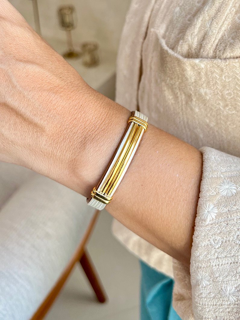 A pulseira Imã Valéria é uma peça sofisticada, confeccionada em couro sintético de tubo e detalhes dourados. Seu design clean é perfeito para criar mix de pulseiras, permitindo combinações exclusivas. O fecho de imã oferece praticidade e segurança. Ideal para quem busca um acessório discreto, mas cheio de estilo, a pulseira Valéria é perfeita para complementar seu visual de forma elegante e moderna.