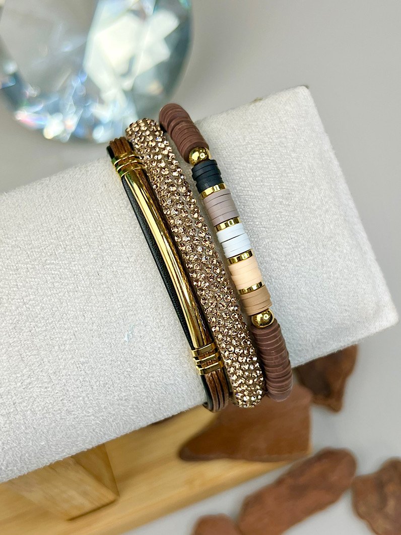O Trio de Pulseiras Ajustável Giovana é composto por uma tira de fimos em tons de marrom, uma tira brilhante marrom e uma tira dourada, criando uma combinação sofisticada e moderna. Com design ajustável, adapta-se perfeitamente ao pulso, trazendo praticidade e estilo ao visual. E o melhor: você pode usar as peças juntas, intercaladas ou combiná-las com outros modelos de pulseiras, garantindo versatilidade para qualquer ocasião.