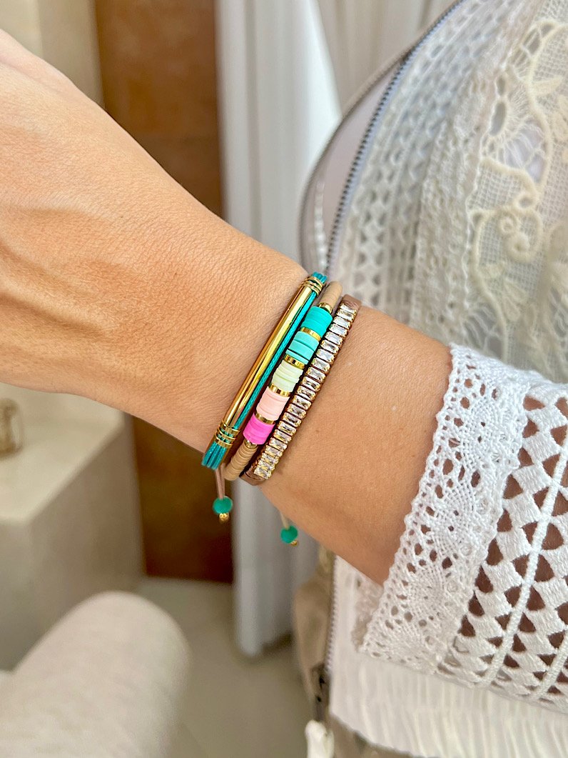 Trio de pulseiras ajustáveis Nicole, com fimos e zircônias douradas, banho ouro.
